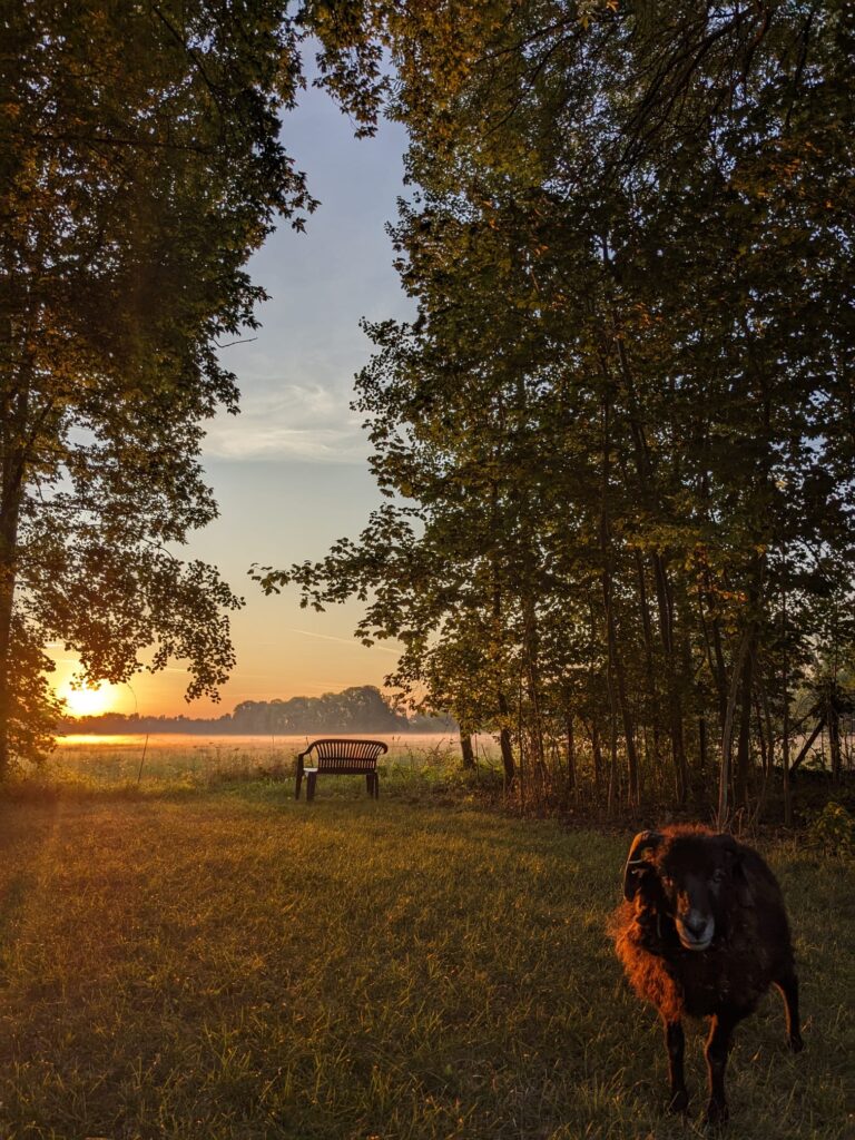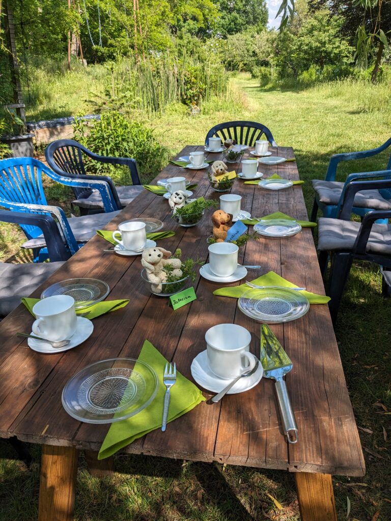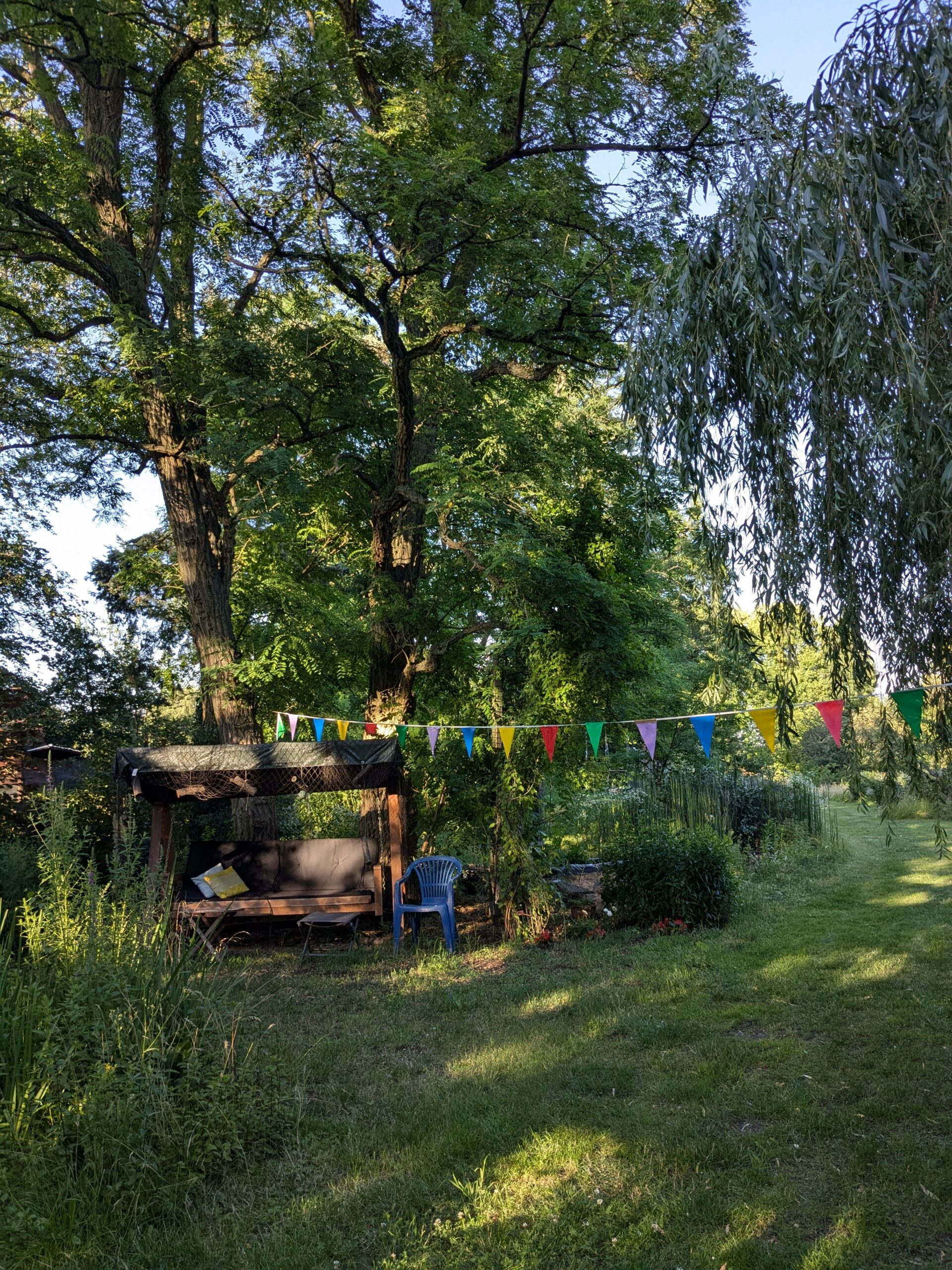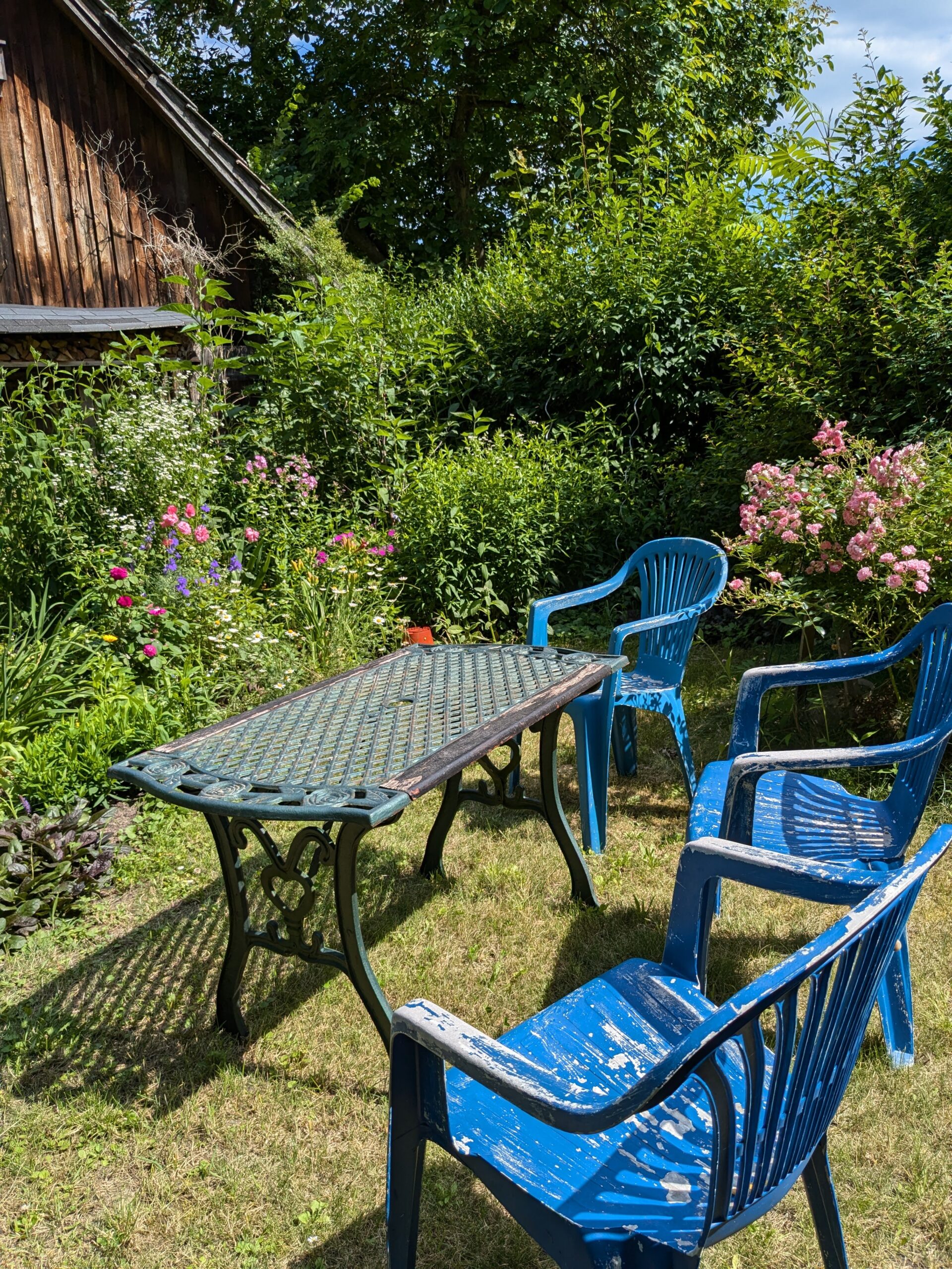 Im Garten sind Hühner, 2 Schafe und der freundliche kleine Mischlingshund Peso zu Hause. Es gibt alte Laubbäume, zwei kleine Teiche mit Goldfischen, eine Lagerfeuerstelle, einen Schuppen mit Werkstatt und 3 Fahrrädern für Ausflüge, eine kleine Fasssauna mit Blick am Rande des Gründstücks mit Blick auf die weiten Felder dahinter. Und jede Menge Platz für Outdoor -Aktivitäten.