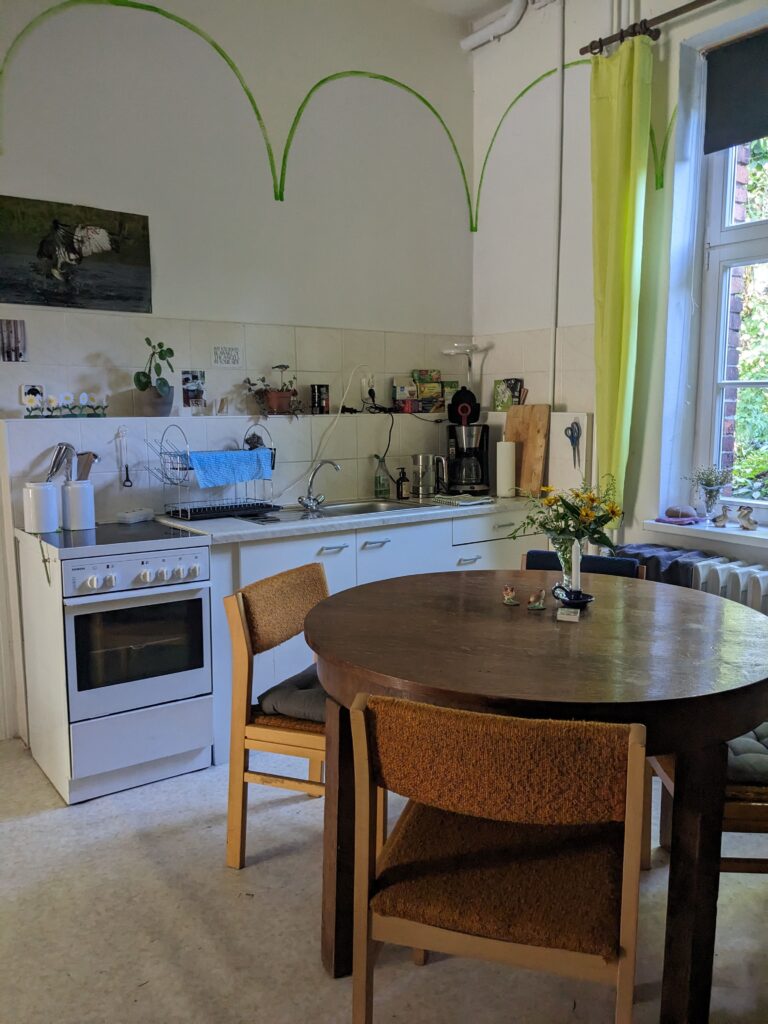 Das Haus selbst hat einen lichten Gemeinschaftsraum mit Klavier und Seminartisch, der für verschiedene Aktivitäten für 10 Personen Möglichkeiten bietet. Gerne laden wir deshalb auch Gruppen für Retreats, Seminare, Kurse und kleinere gesellige Zusammenkünfte (keine Partys) ein. Die Kirche (Baujahr 1860) gegenüber auf dem Dorfanger ist eine Offene Kirche: Sie steht offen und sie heißt alle Menschen willkommen. Sie kann für Meditationen o.ä. genutzt werden. Auch Musikproben (unplugged) könnten hier stattfinden (gute Akustik). Es gibt eine kleine Orgel in der Winterkirche sowie einen betagten Flügel im Kirchenschiff.